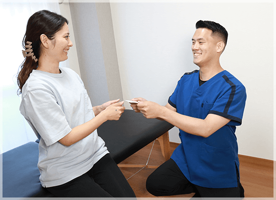 先生の方からこれぐらいの期間で卒業しましょう、と前向きな方向を示してもらえたので痛みから解放される希望がもてました。他院は受け身の施術のみでした。