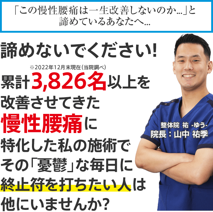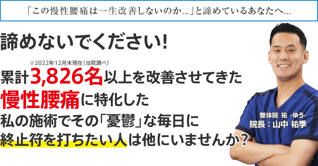 国家資格を有し、幅広い層の腰痛のお客様から支持され、あなたの症状に真正面から向き合う豊中市で唯一の腰痛専門整体院 祐-ゆう-に来院し、もう二度とその痛みに我慢することのない人生を手に入れる道。