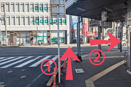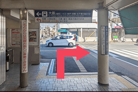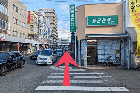大阪方面乗り場から改札を出て「朝日住宅」方向の横断歩道を渡ります。