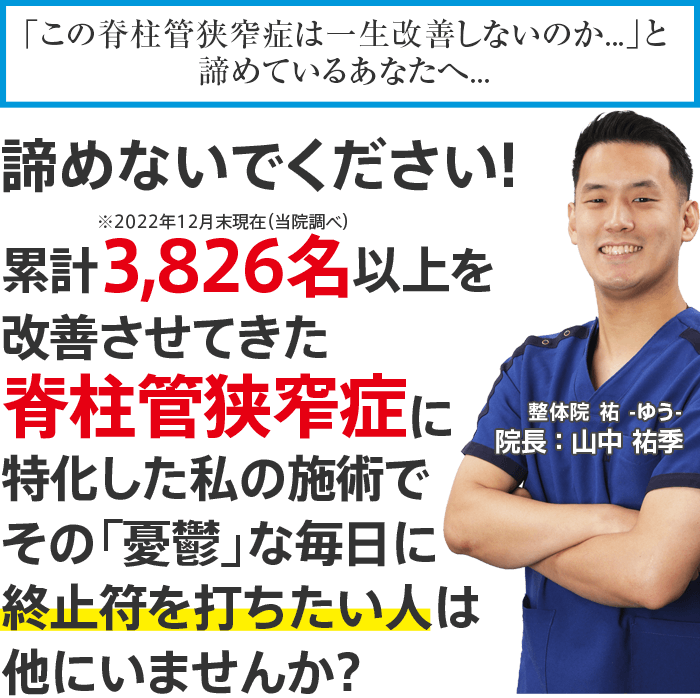 国家資格を有し、幅広い層の脊柱管狭窄症のお客様から支持され、あなたの症状に真正面から向き合う豊中市で唯一の脊柱管狭窄症専門整体院 祐-ゆう-に来院し、もう二度とその痛みに我慢することのない人生を手に入れる道。